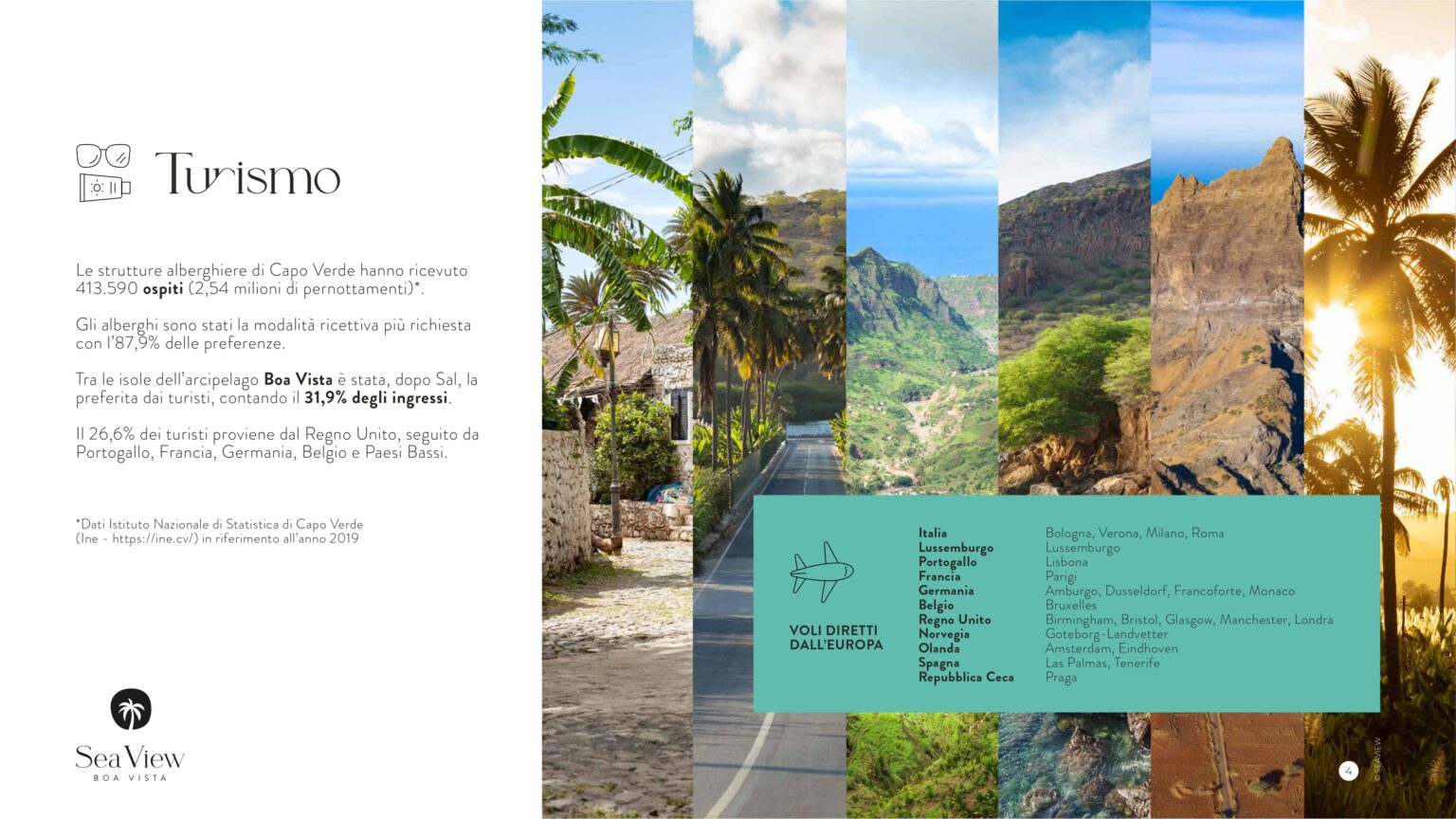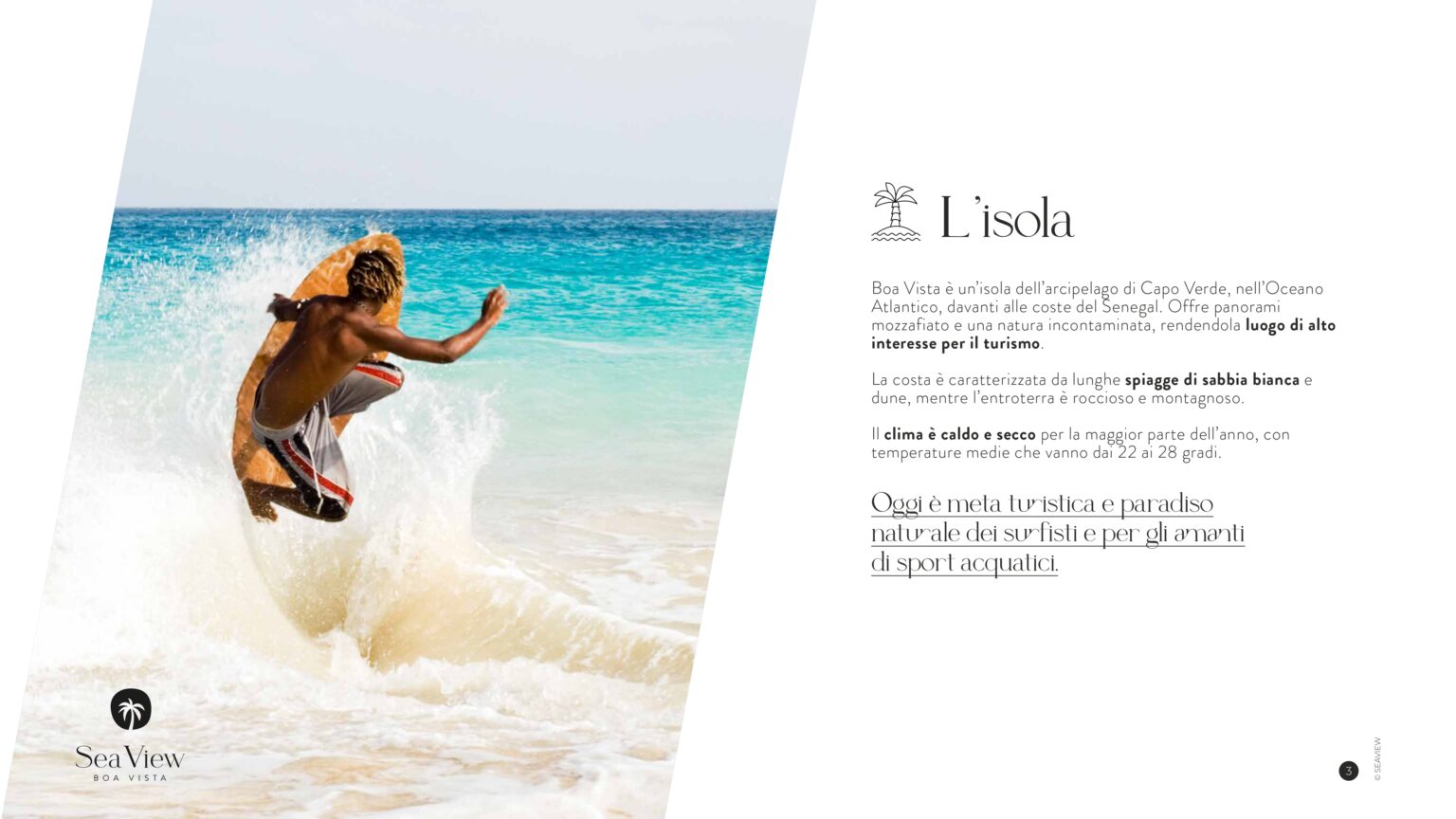 Boa Vista, la più orientale delle dieci isole modellate dalla lava di antichi vulcani, nell’infinita vastità dell’Oceano Atlantico centrale. Una terra dalle suggestive peculiarità, crocevia di itinerari e culture, dialogo di elementi primordiali: il sole, il vento e l’oceano. Qui il tempo rallenta e lascia spazio al benessere, qui la natura incontaminata concede all’architettura solo interventi misurati e accorti.