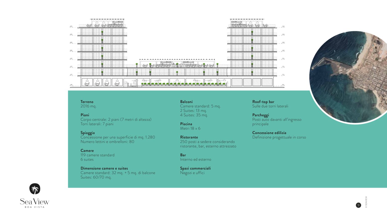 La volumetria realizzabile corrisponde a 23.000 m2, pari a 7.000 m2 lordi. Il progetto visiona un corpo centrale costituito da 2 piani di 7 metri dall’altezza l’uno, e due torri laterali da 7 piani con roof-top bar. L’albergo consisterà di 119 camere standard e 6 suite, oltre che una piscina di 18×6 metri. Il progetto visiona anche la presenza di un ristorante con 250 posti a sedere (considerando ristorante, bar ed esterno attrezzato), un bar (interno ed esterno) e spazi commerciali (negozi e uffici). Indicata anche la presenza di posti auto davanti all’ingresso principale. Inoltre, vi è una concessione per una superficie di spiaggia di 1.280 m2 con 80 lettini e ombrelloni.